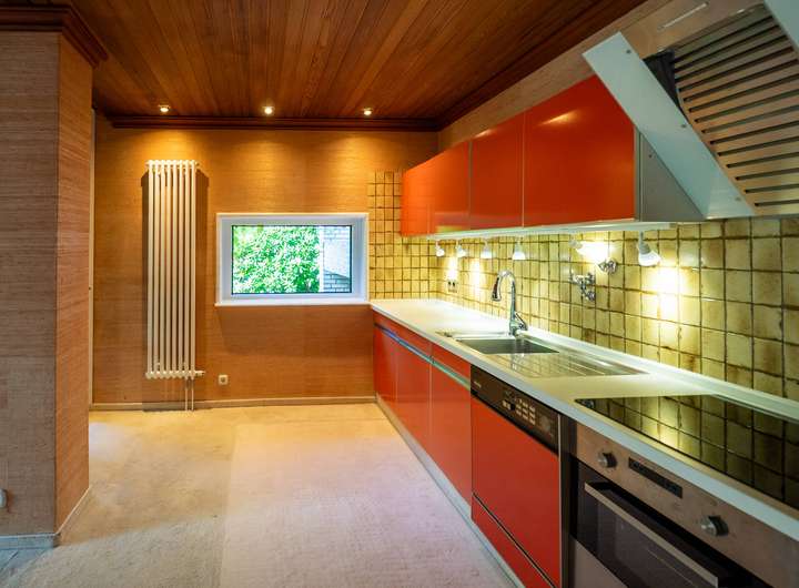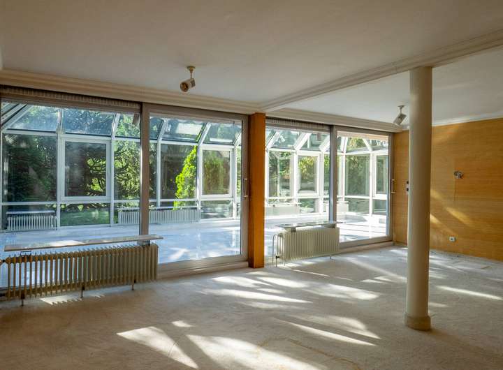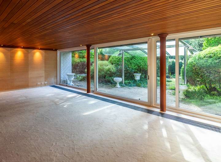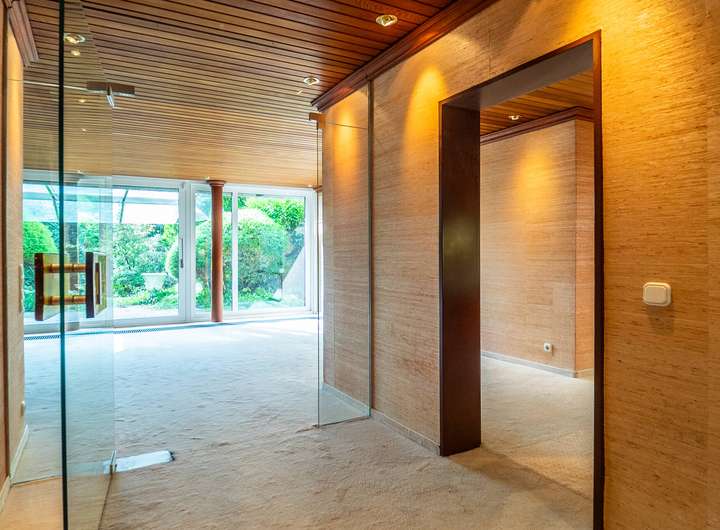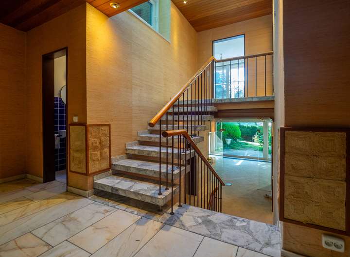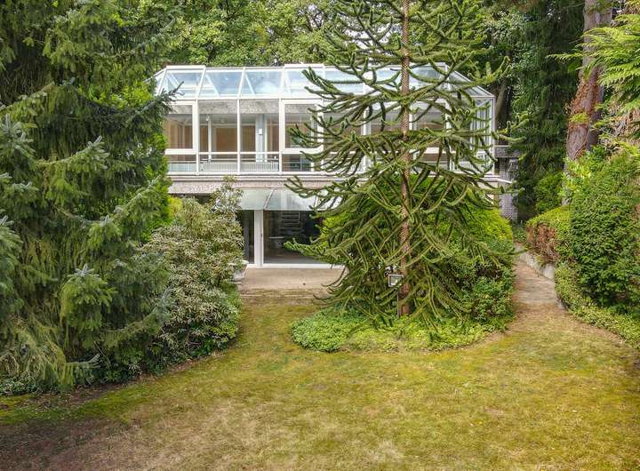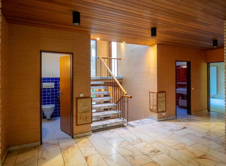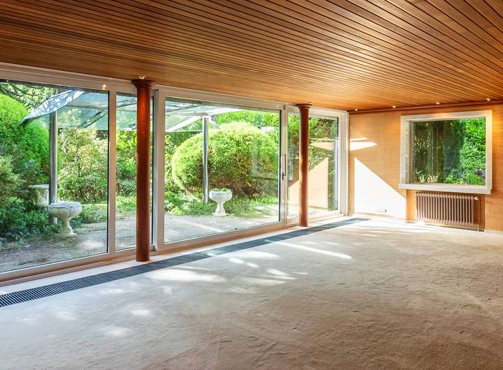 Das massive Wohnhaus wurde Anfang der siebziger Jahre in Split-Level-Bauweise errichtet. Der Grundriss gestaltet sich mit großzügigen Räumen auf vier versetzten Ebenen. Raumbreite Fensterfronten öffnen sich zum Garten und der Wintergarten im Obergeschoss ermöglicht einen Rundblick über das idyllische Grundstück.