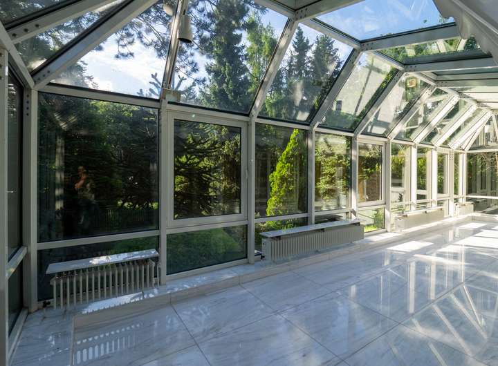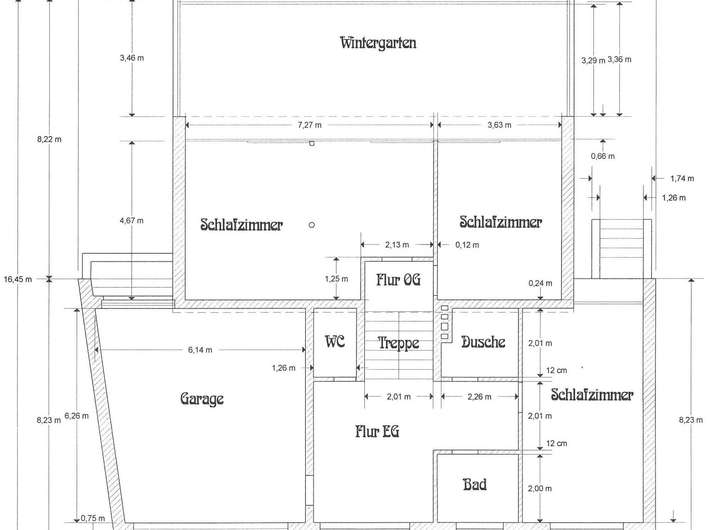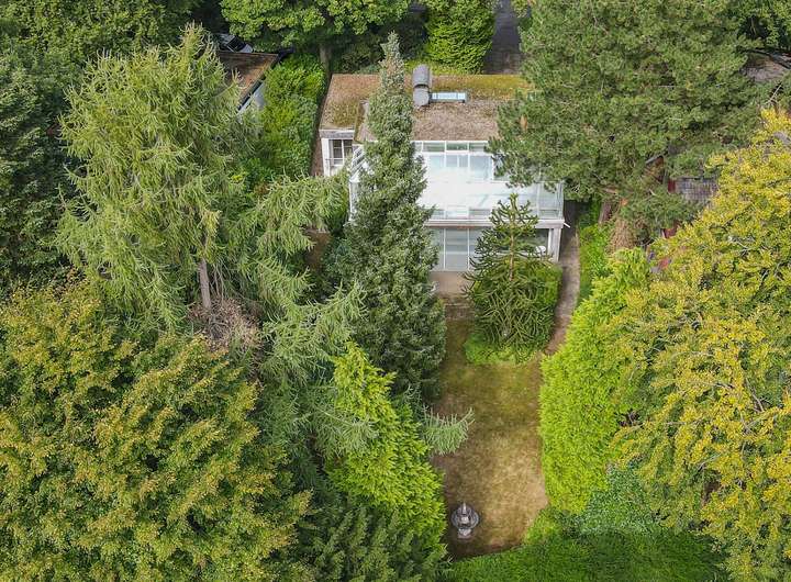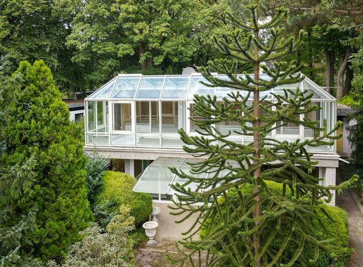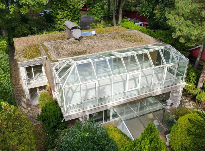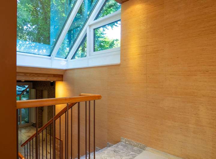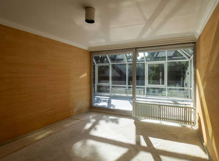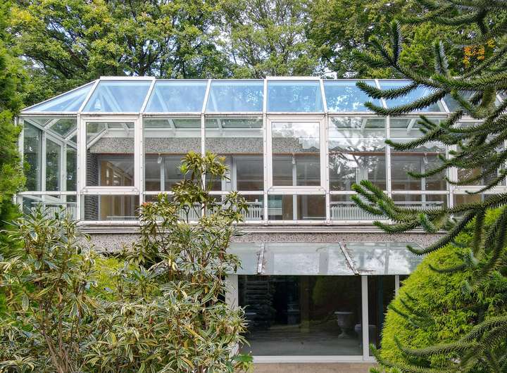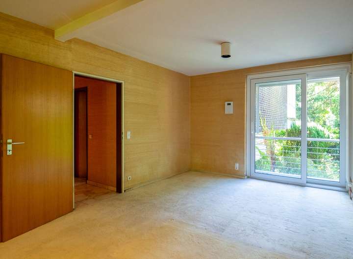 Das massive Wohnhaus wurde Anfang der siebziger Jahre in Split-Level-Bauweise errichtet. Der Grundriss gestaltet sich mit großzügigen Räumen auf vier versetzten Ebenen. Raumbreite Fensterfronten öffnen sich zum Garten und der Wintergarten im Obergeschoss ermöglicht einen Rundblick über das idyllische Grundstück.