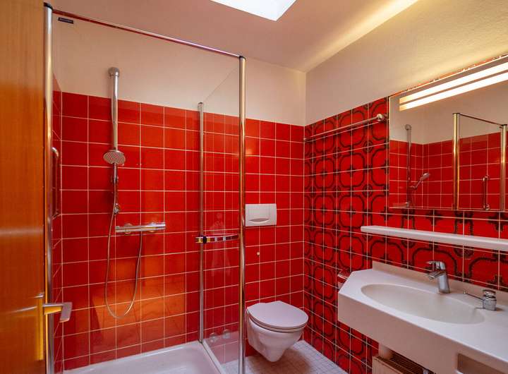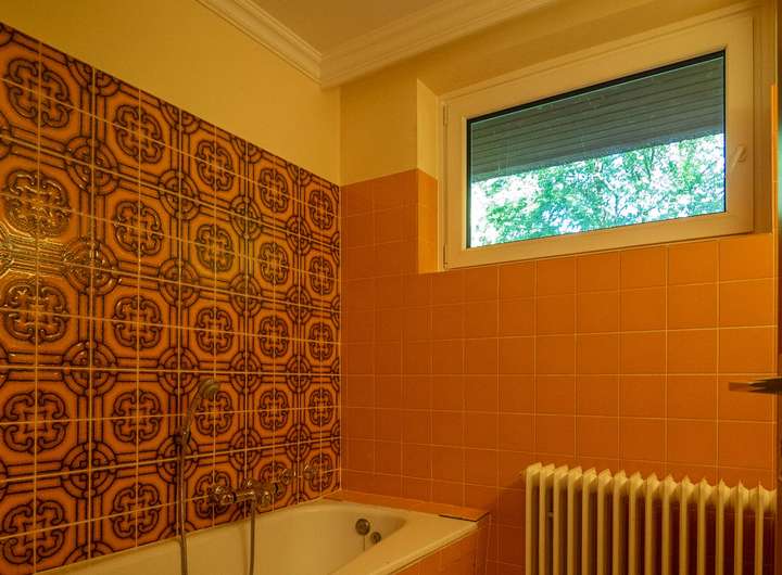 Auf der Ebene des Gartengeschosses befindet sich das geräumige Wohnzimmer, an welches sich die offene Küche anschließt. Vier weitere Zimmer verteilen sich auf drei Ebenen und können bei Bedarf wieder in sechs Zimmer unterteilt werden, wie es der ursprüngliche Grundriss vorsah. Es gibt zwei Bäder, sowohl mit Dusche als auch mit Badewanne und eine Gästetoilette. Die knalligen Farben der Fliesen spiegeln den Zeitgeist wider.