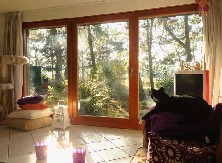 Langlebige wetterbeständige Douglasie Verschalung mit Aussenisolierung, Massive Eichenfenster, Glasierte pflegeleichte Dachpfannen, Kupferdachrinnen. Fussbodenzusatzheizung. Erdgeschoss komplett gefliest.