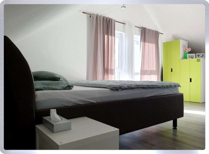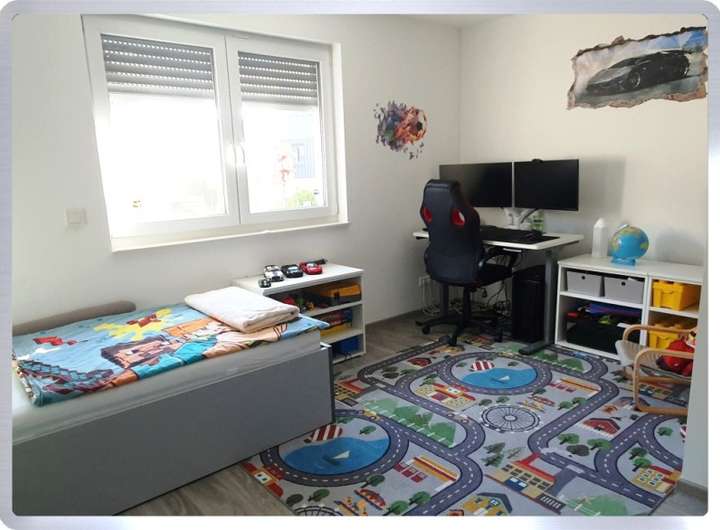Auch das geräumige, derzeit als Elternschlafzimmer genutzte Dachgeschoss mit großzügigen, bodentiefen Fensterfronten eröffnet weitere Nutzungsmöglichkeiten. Bei Bedarf kann hier ohne großen Aufwand ein zusätzlicher Raum mittels Trennwand generiert werden.