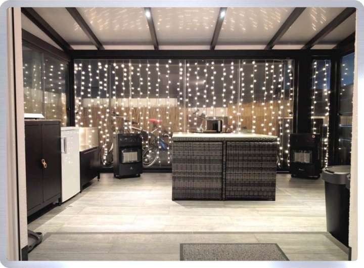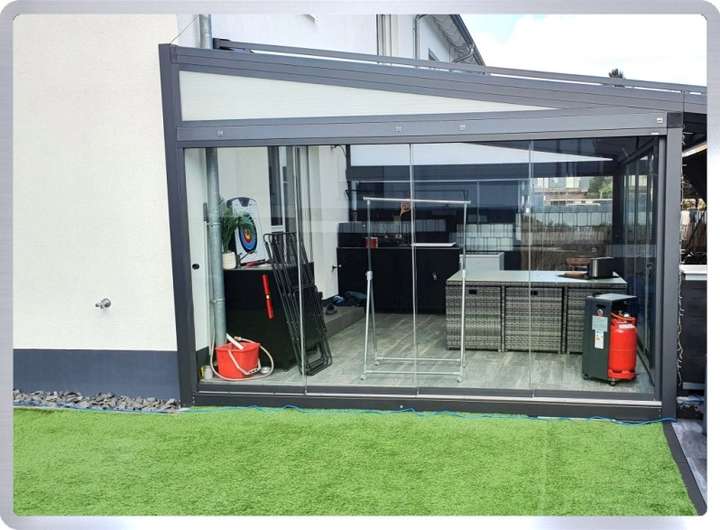• Weitläufige Terrasse, umgeben von exklusivem, rundum geschlossenen Wintergarten mit transparenten Glasflächen und großformatigen Schiebeelementen