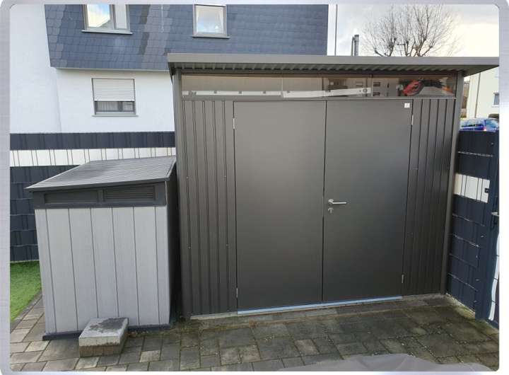 • Garten mit Rasenfläche, hochwertiges Gartenhaus für zusätzlichen Stauraum