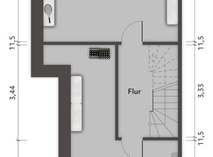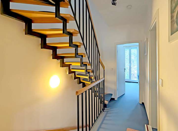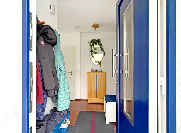 Bereits im Eingangsbereich entsteht ein aufgeräumter, einladender Eindruck, der den Übergang in die Wohnräume angenehm strukturiert. Von hier aus erschließen sich die Bereiche in einer nachvollziehbaren Abfolge, sodass Alltag und Rückzug gut voneinander getrennt wirken.