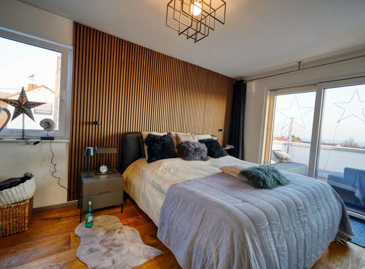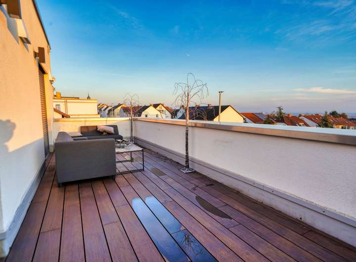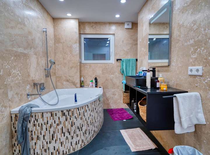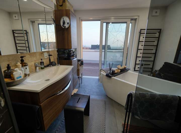 Ein besonderes Highlight bildet das vierte Badezimmer: Ausgestattet mit einer freistehenden Badewanne, einer modernen Dusche sowie einem direkten Zugang zur Dachterrasse, bietet es ein exklusives Wellnessambiente mit privatem Rückzugscharakter.