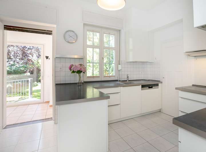 Die hohen Decken und die aufgearbeiteten Dielenböden verleihen dem Haus eine elegante Großzügigkeit. Im Erdgeschoss erwartet Sie ein offener Wohn- und Essbereich, der durch Helligkeit und ein stimmiges Raumkonzept besticht – ideal für gesellige Abende oder entspannte Stunden im Familienkreis. Die Küche bietet direkten Zugang zur geschlossenen Terrasse. Diese bietet einen geschützten Platz für Mahlzeiten bei jedem Wetter und führt wiederum über eine Treppe zur freien Terrasse.