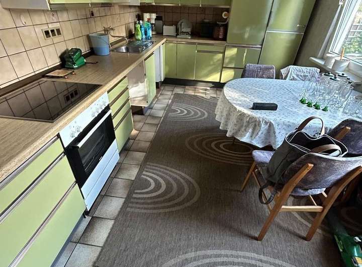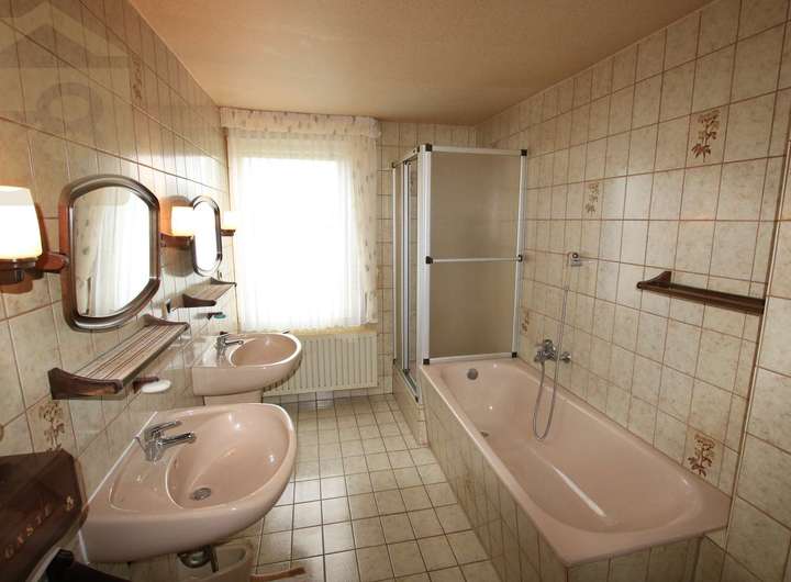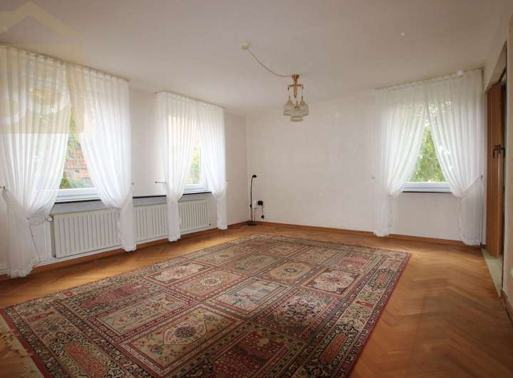 Die Gesamtfläche von 240 m² Wohnfläche verteilt sich auf zwei separate Wohneinheiten im Erd- und Obergeschoss. Das Haus ist renovierungsbedürftig und bietet dem neuen Eigentümer die Möglichkeit, die Gestaltung und Ausstattung nach eigenen Vorstellungen umzusetzen. Derzeit sind die Böden mit einer Mischung aus Teppich, Linoleum und Fliesen belegt. Bereits wichtige Modernisierungen wurden durchgeführt: Die Fenster wurden im Jahr 1999 erneuert und die Heizkörper stammen aus dem Jahr 2000.