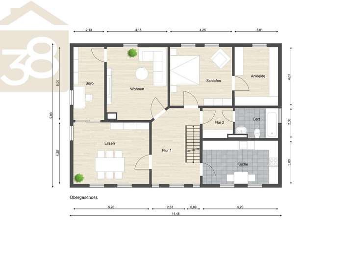 Die zweite Wohneinheit im Obergeschoss ist über das Treppenhaus zugänglich. Sie bietet ebenfalls ein Esszimmer, ein geräumiges Wohnzimmer und eine eigene Küche. Zusätzlich stehen Ihnen ein Büro für ungestörtes Arbeiten sowie ein Schlafzimmer mit Ankleidezimmer zur Verfügung. Das zugehörige Badezimmer ist mit einer Dusche ausgestattet.