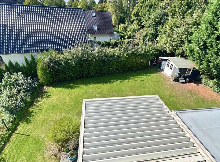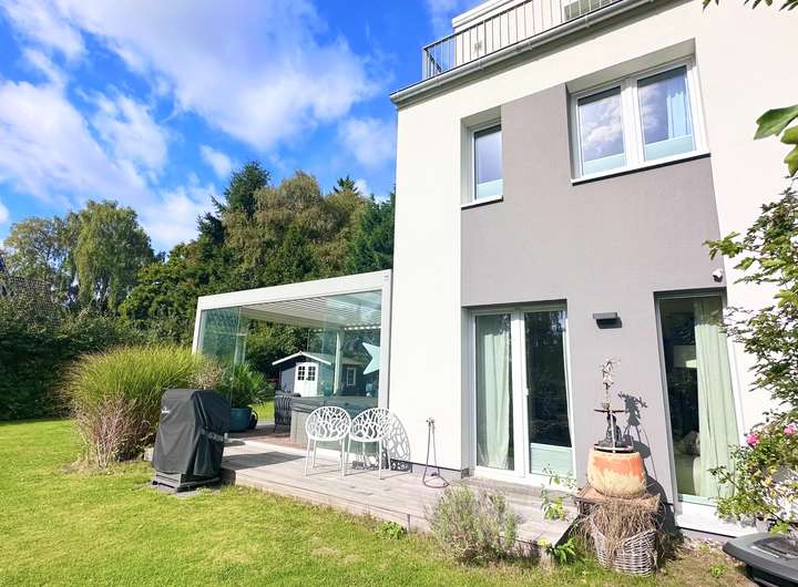 Die durchdachte Raumaufteilung erstreckt sich über drei Ebenen und wird durch einen exklusiven, nachträglich errichteten Wintergarten ergänzt, der den Wohnraum um eine lichtdurchflutete Lounge erweitert. Der großzügige Garten – deutlich größer als bei klassischen Reihenhäusern – schafft ideale Voraussetzungen für Familienleben und Erholung im Grünen.