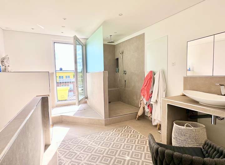 Ein besonderes Highlight bildet das loftartig gestaltete Dachgeschoss mit offenem Bad, direktem Balkonzugang und angeschlossenem Schlafzimmer – ein privater Rückzugsort mit Spa-Charakter. Die moderne, offen integrierte Einbauküche mit hochwertigen Geräten und Bora-Muldenabzug fügt sich elegant in den Wohnbereich ein.