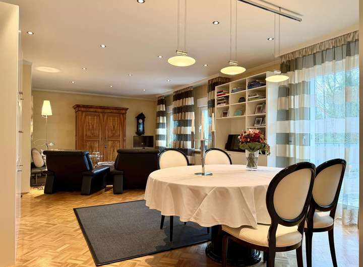 Das Innere des Hauses überrascht. Bereits die großzügige Diele in der Erdgeschosswohnung mit hochwertigem Echtholzparkett sorgt beim Betreten für einen Wow-Effekt. Die Begeisterung geht im ca. 38,60 m² großen Wohn- und Esszimmer mit Blick zur liebevoll angelegten Terrasse und dem ans Wohnzimmer angrenzenden Wintergarten weiter. Diese Wohnatmosphäre sucht seinesgleichen.