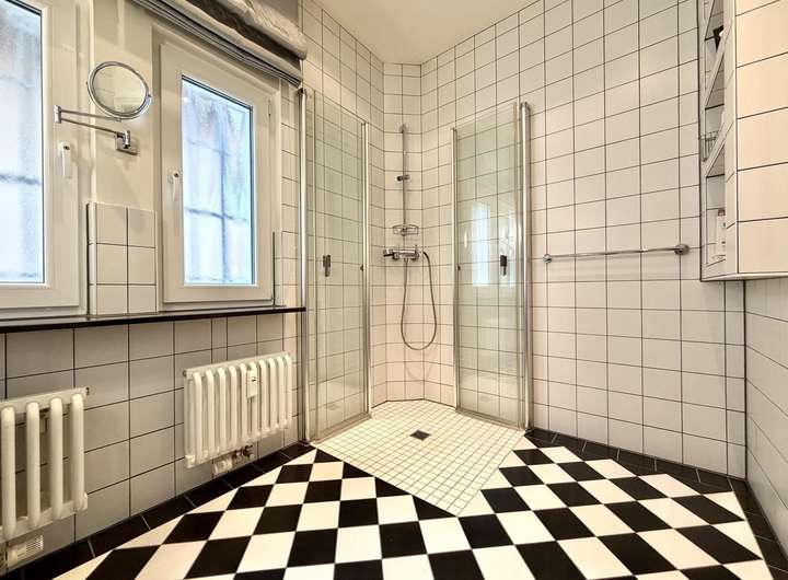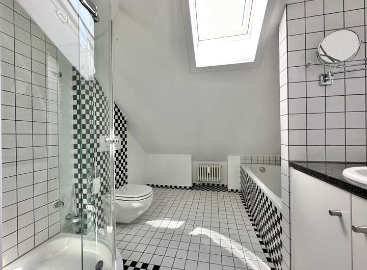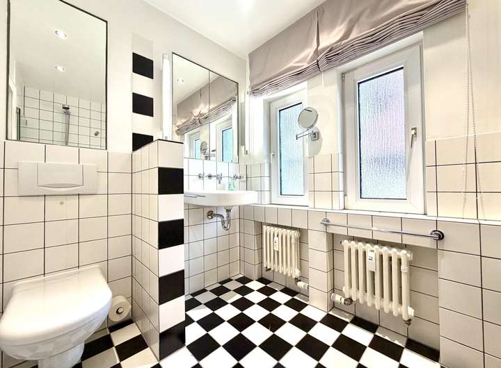 Ein großzügiges Schlafzimmer, ein weiteres Arbeits-/ Kinderzimmer, eine Küche, ein Tageslichtbad mit Dusche sowie ein kleiner Abstellraum vervollständigen die Wohnung im Erdgeschoss mit insgesamt 3,5 Zimmern verteilt auf ca. 127,54 m² Wohnfläche. Die Wohnung ist mit einer hochwertigen SieMatic Küche ausgestattet.