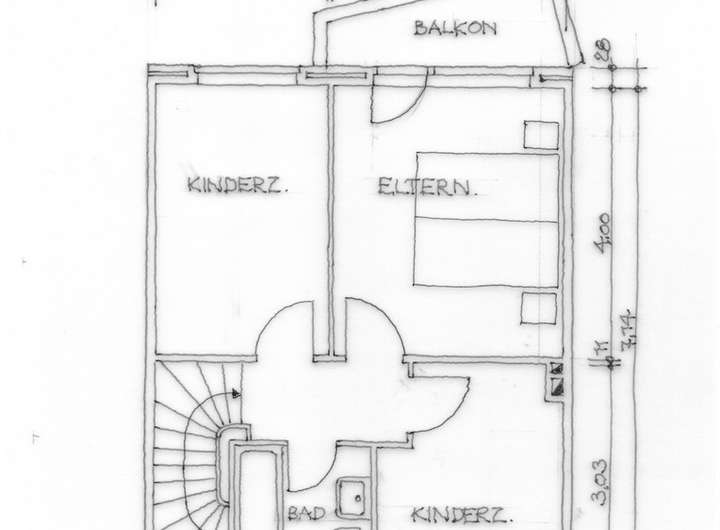 Das Obergeschoss verfügt neben dem Bad und einen kleinen Balkon über zweieinhalb Räume, die als Schlafzimmer, Kinderzimmer oder Heimbüro genutzt werden können.