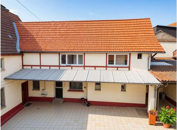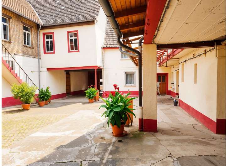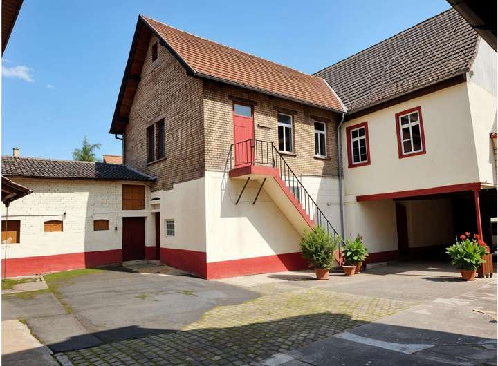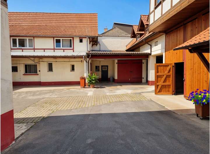 Der Bestandsbau aus dem Jahr 1930 bildet den straßenseitigen und historischen Kern des ehemaligen Hofensembles. Mehrere Gebäude und Flächen gruppieren sich um einen geschützten Innenhof, der dem Objekt eine klare Struktur und einen eigenständigen Charakter verleiht. Das Ensemble vermittelt bereits im Bestand die Großzügigkeit und Tiefe eines klassischen rheinhessischen Anwesens – heute jedoch mit dem klaren Fokus auf Neuentwicklung und Umgestaltung.