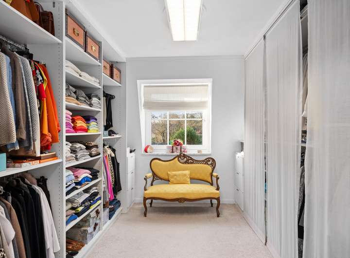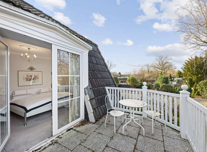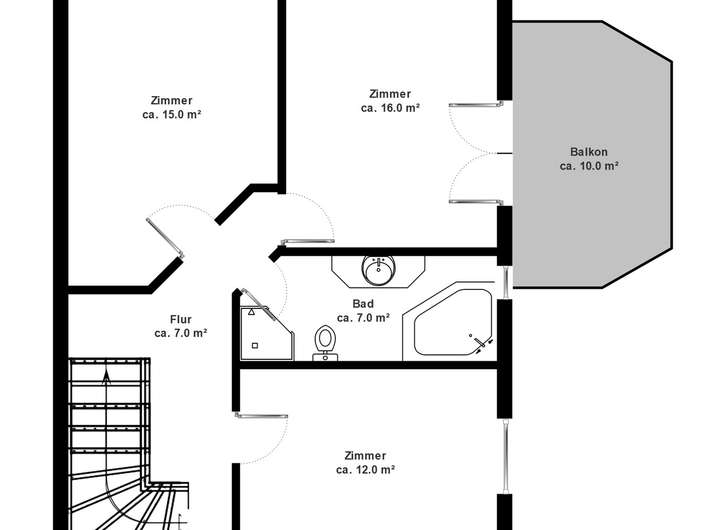 Eine extra breite Betontreppe mit Massivholzgeländer führt ins Obergeschoss. Durch die besondere Dachform des Mansardenwalmdaches und die sechs Gauben sind im Obergeschoss keine Dachschrägen vorhanden, wodurch sich die Zimmer optimal nutzen lassen. Diese weisen eine angenehme Größe auf, sind gut geschnitten und ein Zimmer ist mit bodentiefen Fenstern sowie einem Balkon versehen. Für den nötigen Komfort sorgt das weiße Marmorbadezimmer, welches mit einer Badewanne, einer Dusche sowie einem großen Fenster ausgestattet ist.