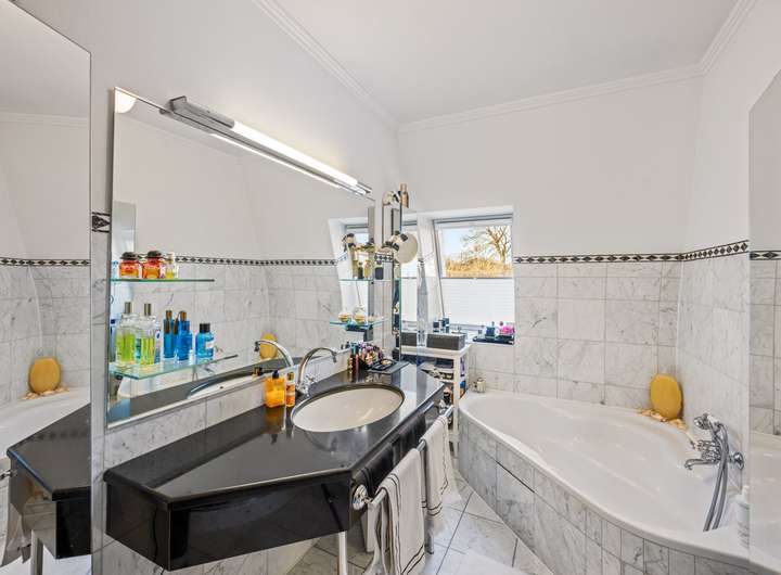 - Weißes Marmorbadezimmer mit Badewanne, Dusche, Fenster sowie schwarzen Marmor-Waschtisch