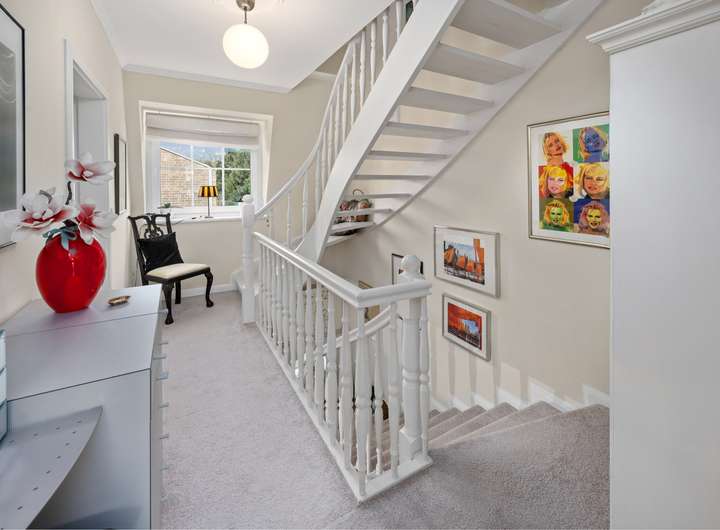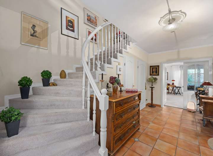 - Elegante und extra breite Massivholztreppe zum Obergeschoss