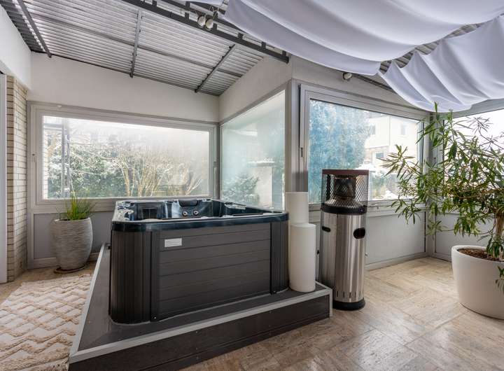 Im zweiten Obergeschoss befinden sich ein weiteres Schlafzimmer, ein Badezimmer, ein Abstellraum sowie eine zweite Küche. Ein besonderes Highlight ist der Kinobereich mit direktem Zugang zum Wintergarten und integriertem Jacuzzi, der einen exklusiven Rückzugsort mit Panoramablick bietet.