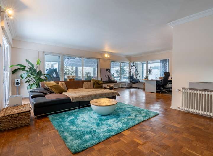 Das erste Obergeschoss bildet den Mittelpunkt des Hauses: Ein helles Wohnzimmer mit angrenzendem Kamin- bzw. Lesezimmer, ein großzügiges Esszimmer mit Zugang zur 2023 neu gefliesten Terrasse sowie eine hochwertige Küche mit Komposit-Arbeitsplatte und Markengeräten schaffen ein einladendes Wohnambiente. Zwei mögliche Schlafzimmer, ein Abstellraum, ein Badezimmer und ein Gäste-WC vervollständigen diese Etage. Hochwertige Bodenbeläge aus Fischgrät-Vinyl und Naturstein verleihen den Räumen eine elegante und zeitlose Atmosphäre.