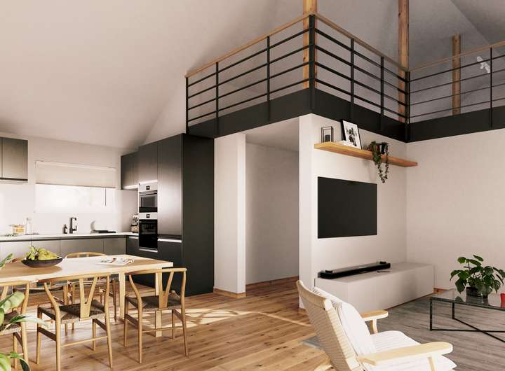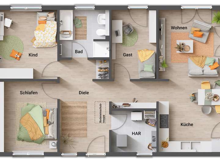 Der offen gestaltete Wohn-, Koch- und Essbereich ist das Zentrum des Familienlebens. Hier wird gemeinsam gekocht, gelacht und entspannt. Die bodentiefen Fenster lassen nicht nur viel Licht hinein, sondern ermöglichen auch vielfältige Zugänge zum Garten. Ob von der Küche oder vom Sofa aus, Ihre Wohlfühloase im Grünen ist stets nur ein paar Schritte entfernt. Besonders praktisch und platzsparend ist die integrierte Garderobe im Flur. Außerdem gibt es verschiedene Wohnbereiche, die auf Wunsch mit (Glas-)Türen abgetrennt werden können.