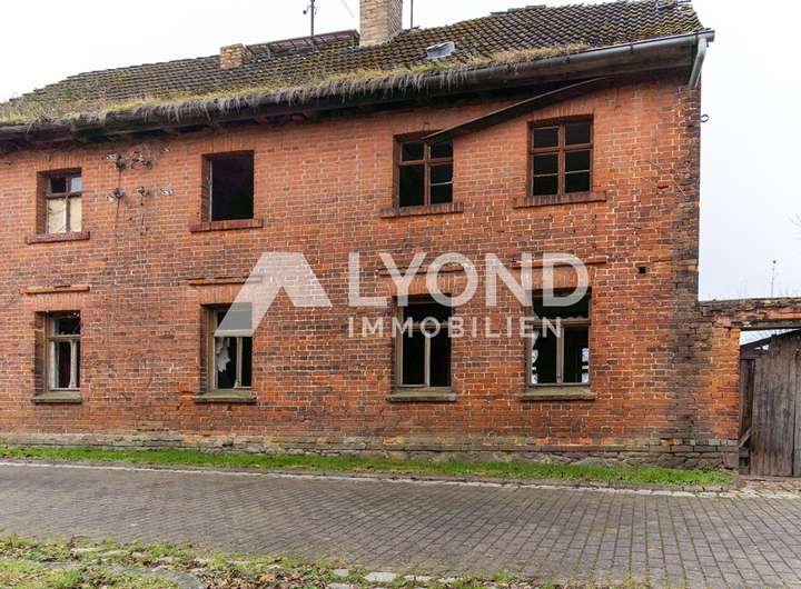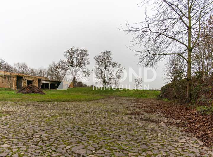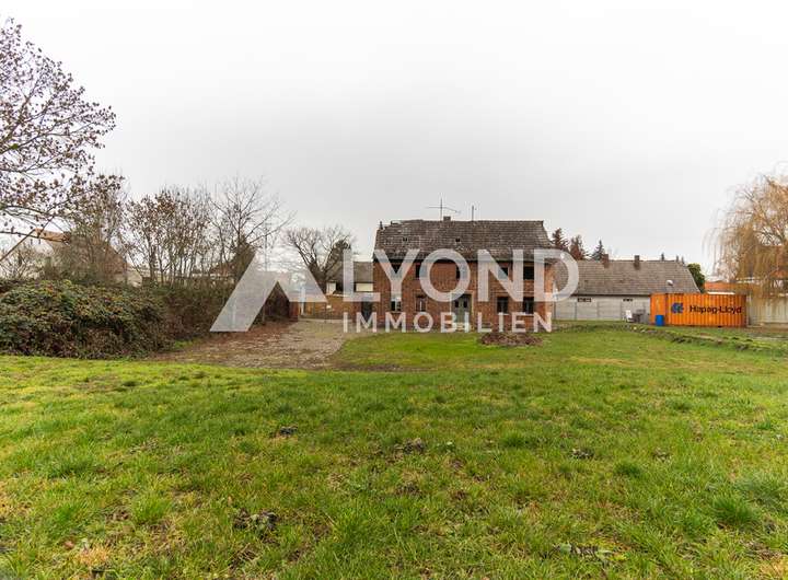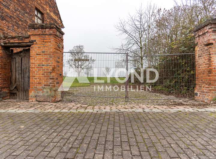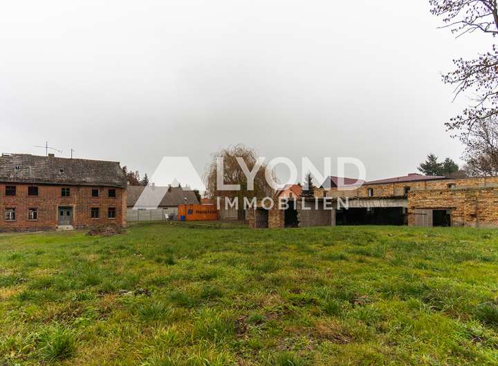 Den Rahmen des Areals bilden auf der Vorderseite ein älteres, nicht denkmalgeschütztes Gebäude und zur linken Seite die stimmungsvollen Überreste einer ehemaligen Scheune mit einer markanten Geländesenke. Nach hinten öffnet sich das Grundstück zu einem weitläufigen Feld, getrennt durch einen Graben, wodurch ein besonders reizvoller Blick in die Ferne entsteht. Zur rechten Seite zeigt der einsetzende Pflanzenbewuchs die Grenze zum Nachbargrundstück an.