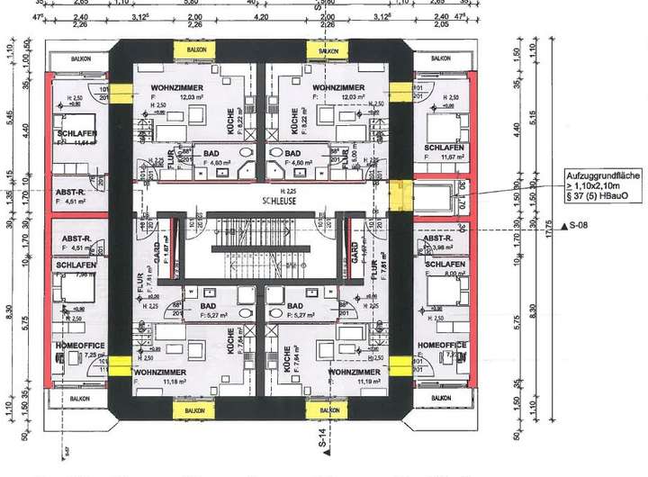 Im Untergeschoss befinden sich Technikräume, sowie Platz für mögliche Kellerräume für die Bewohner, Müll- und Fahrradräume. Darüber liegen noch fünf Geschosse, wobei die Böden und Decken im zukünftigen Wohnbereich angepasst werden müssen, um die erforderliche Raumhöhe zu erreichen (siehe Schnitt). Geplant sind vier Etagen mit z. B. jeweils vier Zwei-Zimmer-Wohnungen, insgesamt also 16 Wohneinheiten. Das Treppenhaus befindet sich im Zentrum des Bunkers; ein Aufzug könnte seitlich in einem Anbau ergänzt werden. Das Grundstück hinter dem Bunker kann als Kinderspielfläche genutzt werden.