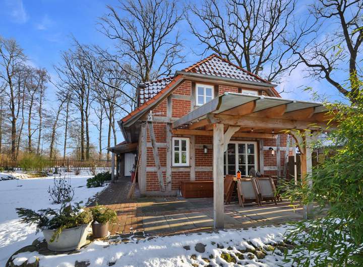 Manche Häuser erzählen Geschichten. Dieses liebevoll neu aufgebaute Fachwerkhaus tut genau das – und schreibt sie gleichzeitig weiter. Im Jahr 2021 wurde es mit großer Sorgfalt und Respekt vor der historischen Substanz ausgebaut und energetisch auf den heutigen Stand gebracht. Entstanden ist ein Ort, der Vergangenheit und Gegenwart in perfekter Harmonie vereint. Eingebettet in ein wunderschönes Grundstück mit direktem Zugang zum "Schwarzwasser", umgeben von altem Baumbestand und liebevoll angelegten Beeten, bietet dieses Zuhause Ruhe, Natur und ein Lebensgefühl, das man nur selten findet. Sie hören das Rascheln der Blätter, sehen das Licht zwischen den Bäumen tanzen und spüren sofort: Hier darf ich ankommen! Schon beim Betreten empfängt das Haus mit einer behaglichen, warmen Ausstrahlung. Der offen gestaltete Wohn-, Ess- und Küchenbereich bildet das Herzstück des Erdgeschosses – lichtdurchflutet, großzügig und geprägt von sichtbaren Holzbalken, die dem Raum Tiefe und Authentizität verleihen. Vom Wohnbereich aus öffnet sich der Zugang zur überdachten Terrasse – ein geschützter Lieblingsplatz für jede Jahreszeit. Ob Frühstück im Sommerregen, ein Glas Wein am Abend oder einfach der Blick ins Grüne: Hier verschwimmen Innen-, und Außenleben auf wunderschöne Weise. Ergänzt wird das Erdgeschoss mit einem gemütlichen Schlafzimmer, einem stilvollen Bad mit Dusche und Badewanne sowie dem gelungenen Dielenbereich, der den Fachwerkcharme gekonnt unterstreicht. Das traumhafte Dachgeschoss erreichen Sie über die schicke Holztreppe. Es bietet einen großen, offenen Raum mit gemütlichen Ecken – perfekt zum Lesen, Arbeiten oder Entspannen - ein Rückzugsort mit ganz eigenem Charakter, der sich flexibel an Ihre Bedürfnisse anpasst. Im neu erstelltem Anbau befindet sich der Hauswirtschaftsraum, der stets trockenen Fußes durch den überdachten Eingang zu erreichen ist. Sind Sie auf der Suche nach einem Unikat und möchten ländlich - ehrlich - unverfälscht wohnen? Dann melden Sie sich gern.