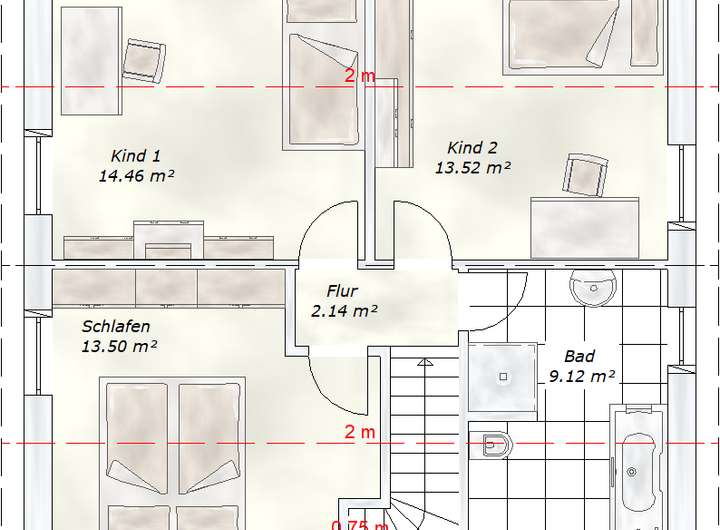 Und auch in der oberen Etage haben sowohl die Kids als auch die Eltern ausreichend Platz in den entsprechenden Räumen: Rund 14 und 14 qm misst der Bereich für den Nachwuchs und fast 14 qm das Eltern-Schlafzimmer. Effizient nennt unser Architekt das Raum-Konzept, das bewusst auf Details wie eine begehbare Ankleide o.ä. verzichtet. Natürlich kann unsere Baufamilie mit ihren eigenen Vorstellungen und Wünschen die beiden Geschosse auch ganz individuell gestalten!