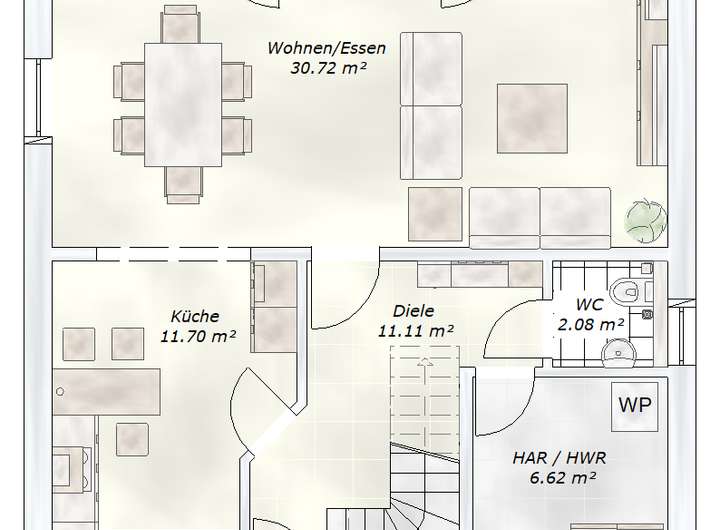 Ein „luftiger“ Grundriss lässt die Wohnfläche im Erdgeschoss größer aussehen, als sie „zahlenmäßig“ ist. Kein neuer Trick, sondern bei vielen Familien bereits angenehme Realität: die offene Küche. Knapp 42 qm Wohn-Ess-Bereich schaffen definitiv eine Wohlfühl-Atmosphäre!