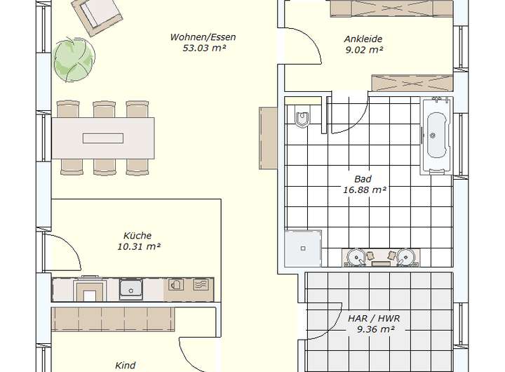 Richtig Platz – und das ist jetzt ganz sicher nicht übertrieben – hat die Familie im Wohn-Ess-Bereich: Bei offener Küche kann hier der Kulinarik-Vortrag (man kann auch Mittagessen sagen) auf 63 qm zelebriert werden! Abgerundet wird das Ganze durch die obligatorische Ankleide neben dem Eltern-Schlafzimmer, damit das Familien-Oberhaupt (er, sie, es) endlich die 42 Paar Schuhe geordnet unterbringen kann. Also, wir meinen, ein bisschen genial ist das ganze Haus schon, oder?