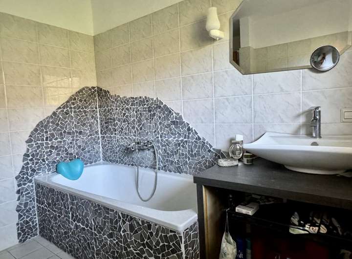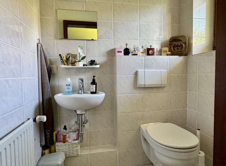 Ein Vollbad, das Gäste-WC mit Dusche, der Vollkeller mit vielen Nutzungsmöglichkeiten runden diese Wohneinheit sinnvoll ab.