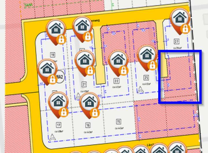 Das Baugebiet ‚Herrengüter West III‘ befindet sich am nördlichen Ortsrand und grenzt östlich an das bestehende Baugebiet ‚Herrengüter II‘. Das angebotene Grundstück liegt am östlichen Rand des neuen Baugebietes ‚Herrengüter III‘.