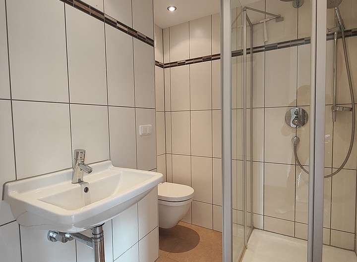 * Dachgeschoss: deckenhoch gefliestes Bad mit Bordüre, Duschwanne, Duschkabine, wandhängendem WC, Waschtisch und Handtuchalter-Heizkörper