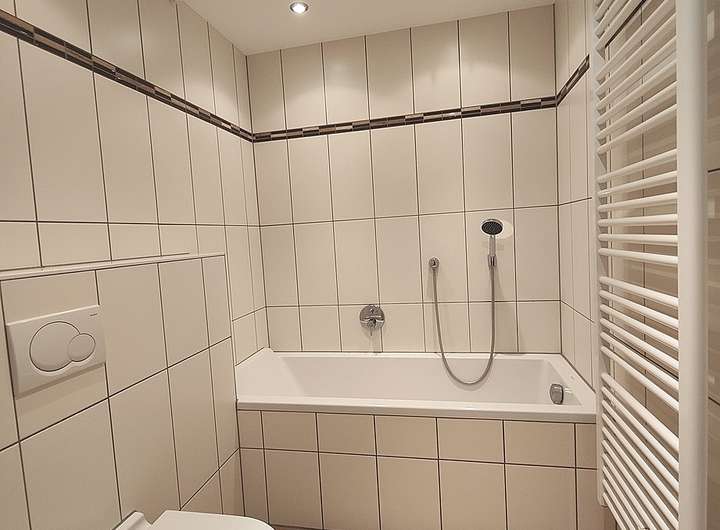 * Obergeschoss: deckenhoch gefliestes Bad mit Bordüre, Badewanne, wandhängendem WC, Waschtisch und Handtuchalter-Heizkörper