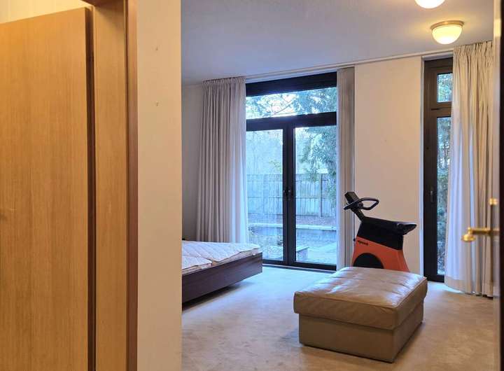 Neben dem Wohnzimmer liegt ein großzügiges Schlafzimmer mit ca. 20 m², das über ein direkt angeschlossenes Badezimmer mit ca. 11,84 m² verfügt. Das Badezimmer ist mit einer ebenerdigen Dusche sowie einer Badewanne ausgestattet. Auch hier sorgen große Fensterfronten für viel Licht, sowohl vom Schlafzimmer als auch vom Badezimmer aus besteht ein direkter Zugang zur Terrasse und in den Garten.