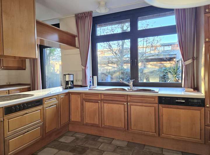 Über die Wohndiele gelangt man außerdem in die hochwertige Einbauküche mit ca. 16,60 m², die mit allen notwendigen Küchengeräten ausgestattet ist. Auch von hier aus besteht ein Außenzugang zur Terrasse. Angrenzend befindet sich ein praktischer Hauswirtschaftsraum.