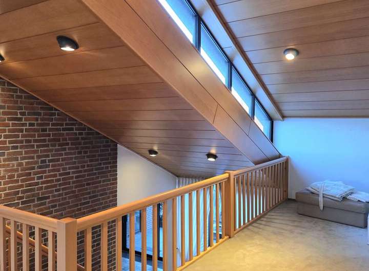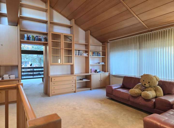Das Obergeschoss besticht durch einen großen, offenen Wohnraum, der sich vielseitig nutzen lässt und über ein angrenzendes Gäste-WC verfügt. Zahlreiche Einbauschränke, teils offen gestaltet und ideal für Bücher oder Dekoration, bieten zusätzlichen Stauraum und unterstreichen die hochwertige Gestaltung dieses Bereichs. Zwei großzügige Schlafzimmer bieten ebenfalls viel Platz und Komfort auf dieser Ebene.