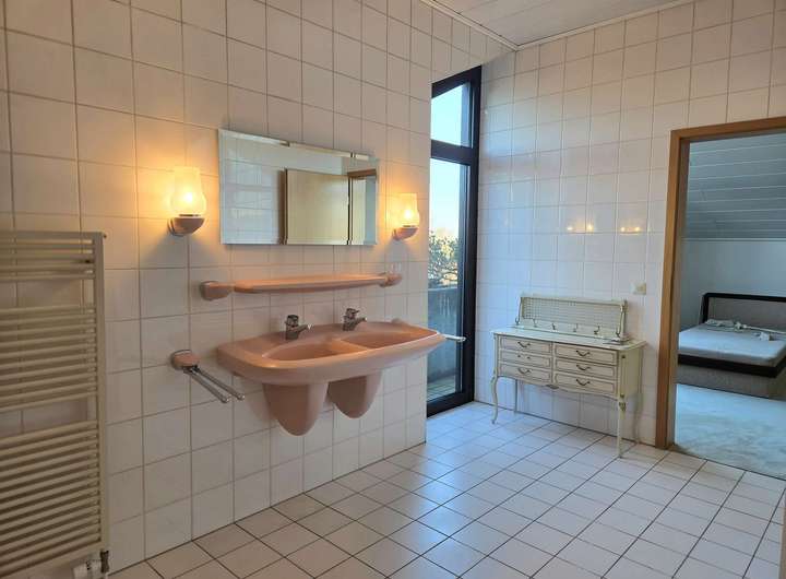 In allen Zimmern und Bädern des Obergeschosses sorgen bodentiefe Fenster mit französischem Austritt für helle Räume und eine angenehme Verbindung nach außen.