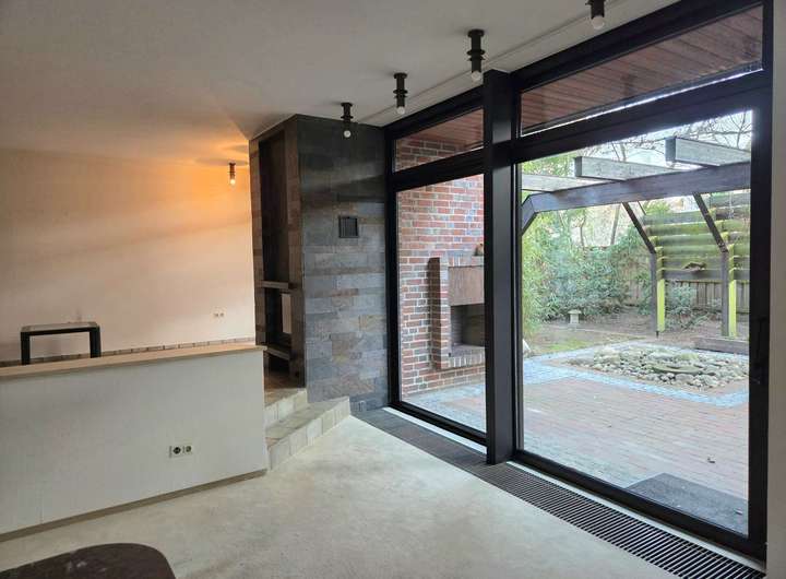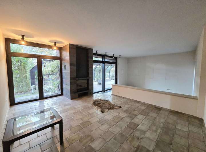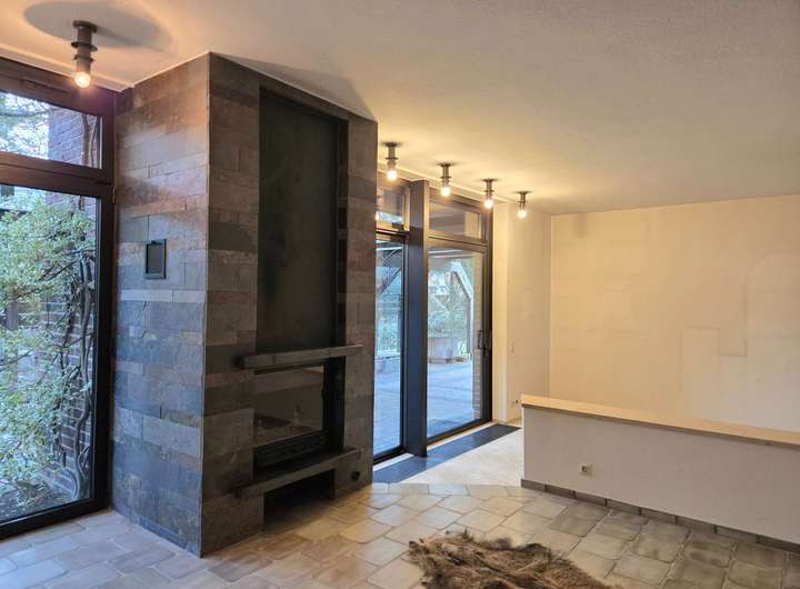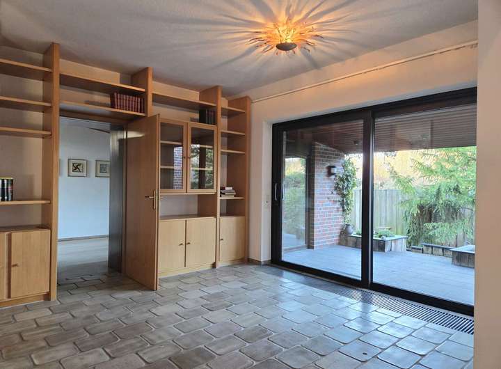 Rechts angrenzend befindet sich das großzügige Wohnzimmer mit ca. 42,10 m². Große, bodentiefe Fensterfronten sorgen für viel Tageslicht und ein offenes Raumgefühl. Ein Kaminofen schafft eine angenehme Wohnatmosphäre, während der direkte Zugang zur überdachten Terrasse und in den Garten den Wohnraum nach außen erweitert.