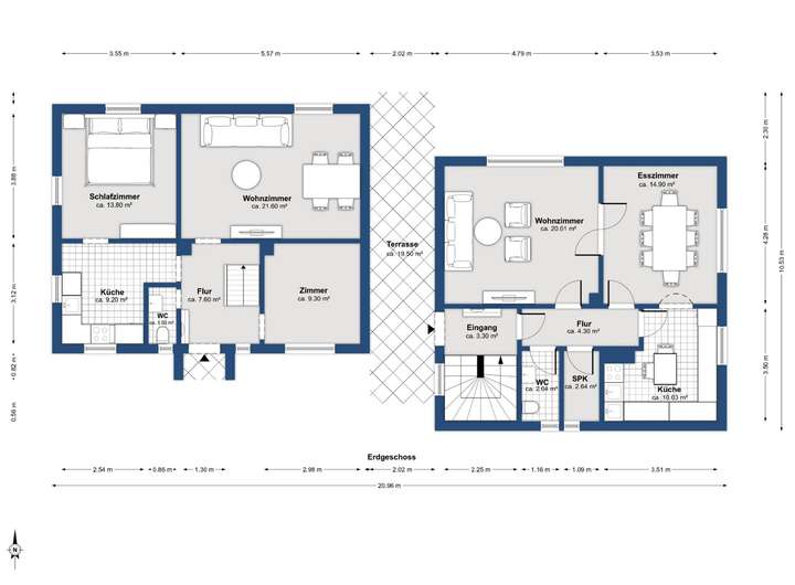 Zum Verkauf steht ein großzügiges Grundstück mit einer Fläche von über 833 m², bebaut mit zwei baulich miteinander verbundenen Wohnhäusern.