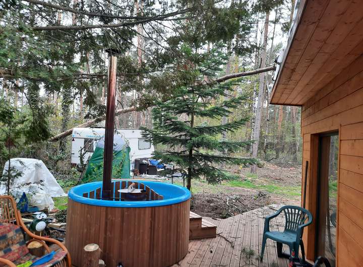Zum Verkauf kommt ein Waldgrundstück in einem Sondernutzungsgebiet, bebaubt mit einem 2020/21 Kernsanierten Bungalow mit ca. 50 qm Wohnfläche zuzüglich Terrasse, Schuppen, Außensauna und Hottube. Heizung mittels Luft-Luft Wärmepumpe und zusätzlicher mobiler Ölheizung. Ganzjährig bewohnbar. Grosser Hauptraum mit Küchen- und Wohnbereich, kleiner Schlafraum, Bad mit WC, Urinal, Waschtisch und Dusche.