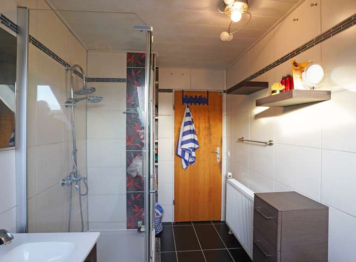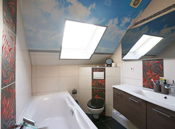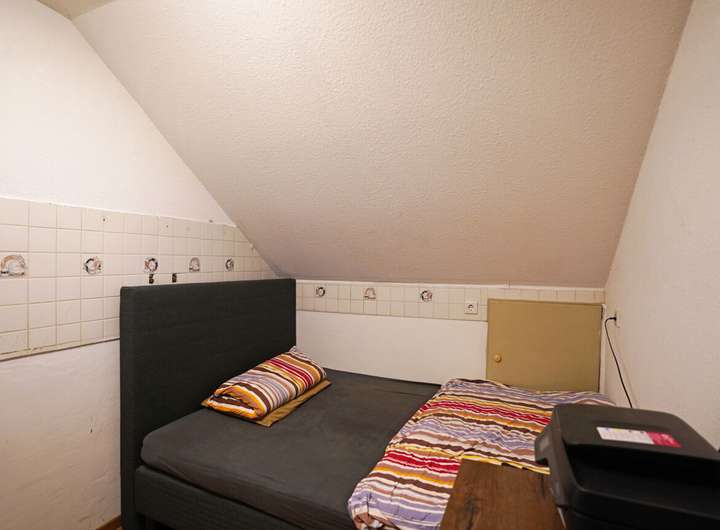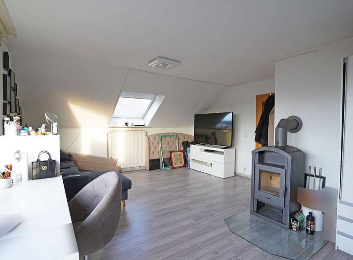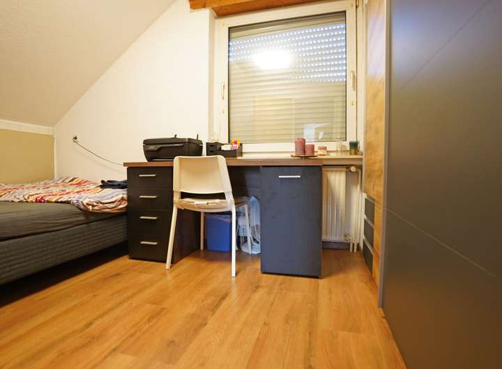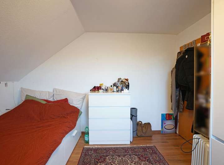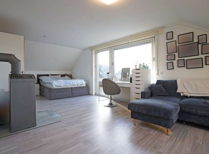 Das Dachgeschoss umfasst ein kleines Gäste- oder Arbeitszimmer, ein Vollbad sowie zwei Kinderzimmer. Eines der Zimmer ist besonders großzügig geschnitten, verfügt über einen Zugang zum Balkon und war früher das Wohnzimmer der Einliegerwohnung. Ein Kaminofen verleiht diesem Raum eine gemütliche Atmosphäre und macht ihn zu einem besonderen Rückzugsort.