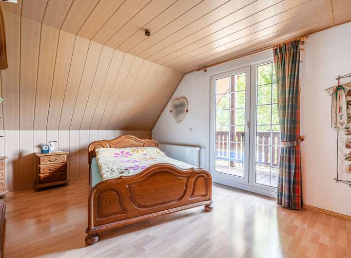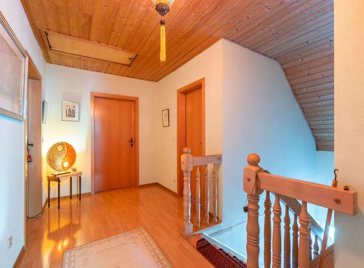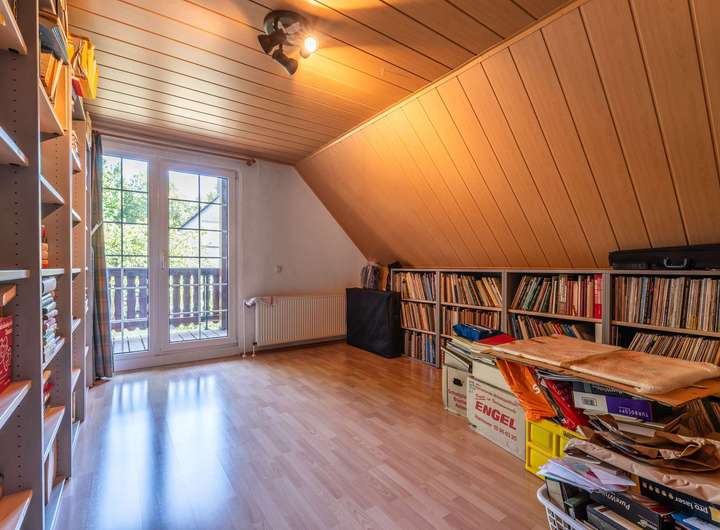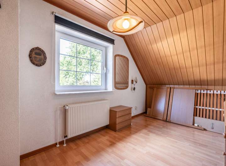 Im Obergeschoss befinden sich vier gut geschnittene Räume. Diese eignen sich ideal als Elternschlafzimmer, zwei Kinderzimmer sowie ein zusätzliches Homeoffice – perfekt für Familien, die Wert auf Rückzugsorte legen. Ein überdachter Balkon lädt dazu ein, die Morgensonne und den Blick ins Grüne zu genießen. Zusätzlich steht ein ausbaufähiger Spitzboden zur Verfügung, der weiteres Potenzial eröffnet.
