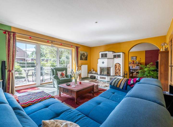 - großer Wohn- Essbereich mit Kamin im Mittelpunkt