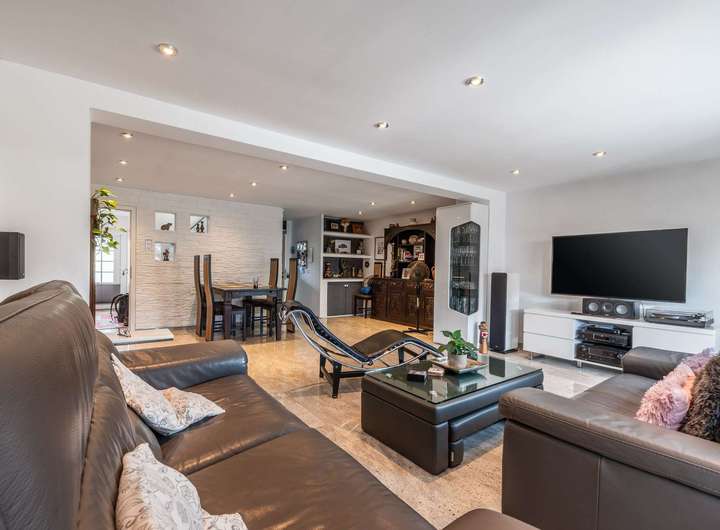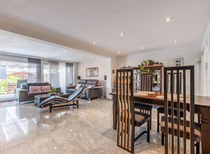 Ein echtes Highlight ist der Wohnzimmeranbau von 2010: Großzügige bodentiefe Schiebeelemente sorgen für ein lichtdurchflutetes Ambiente und öffnen den Blick in den Garten – ein Ort zum Wohlfühlen und Genießen.