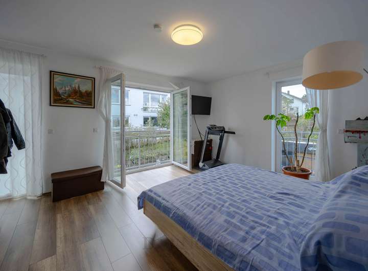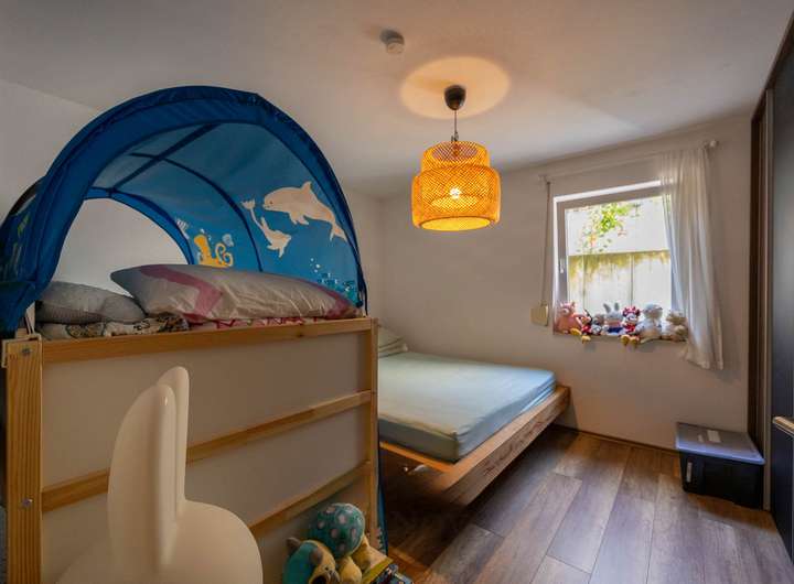 Schon beim Betreten spürt man die harmonische Verbindung aus Komfort und Wärme. Das Erdgeschoss empfängt Sie mit einem weitläufigen Wohnzimmer, das mit großen Fenstern und direktem Zugang zur Terrasse und in den Garten ein Gefühl von Freiheit vermittelt. Hier wird jeder Sonnenstrahl zum kleinen Glücksmoment. Ein Gästezimmer und ein modernes Bad runden diese Ebene ab.