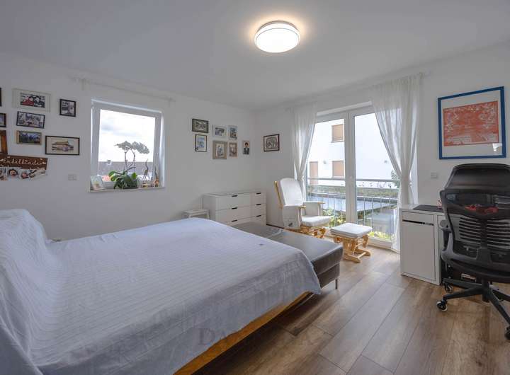 Im Obergeschoss erwarten Sie drei großzügige Schlafzimmer, von denen zwei Zugang zu einem sonnigen Balkon bieten – perfekt für einen Morgenkaffee mit Blick ins Grüne. Ein familienfreundliches Bad mit Wanne und separater Dusche sorgt für entspannte Momente für Groß und Klein. Das Dachgeschoss bietet zusätzliches Ausbaupotenzial von ca. 38 m², sodass Ihr Zuhause flexibel mit Ihren Bedürfnissen wachsen kann.