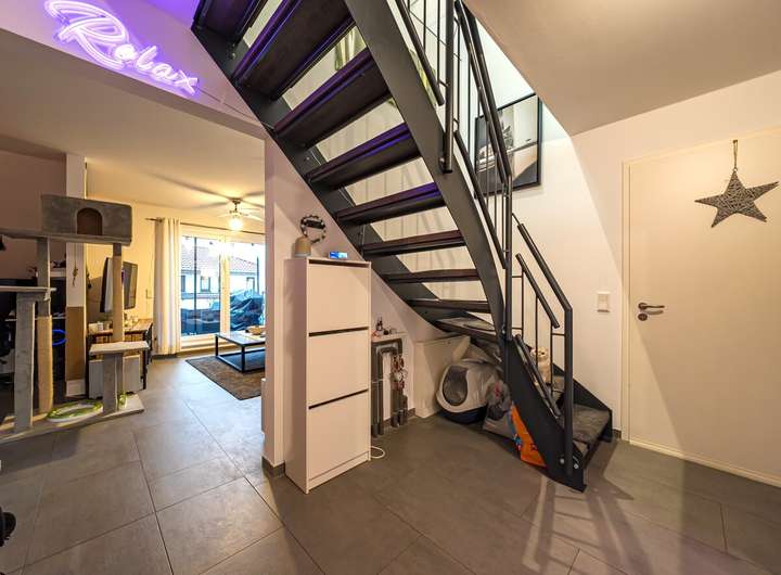 Treppenhaus: Betontreppe mit Fliesenbelag