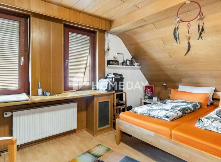 Im Erdgeschoss erwartet Sie ein großzügiges Wohnzimmer mit Kaminofen, das zum Verweilen einlädt, sowie ein Esszimmer, das sich ideal für gesellige Runden eignet. Die offen gestaltete Einbauküche mit hochwertigen Markengeräten bildet das Herzstück des Hauses. Abgerundet wird diese Etage durch ein modernisiertes Badezimmer. Im Obergeschoss befinden sich das helle Schlafzimmer sowie ein weiteres Badezimmer, das mit einer Eckbadewanne, separater Dusche, Tageslicht und einem Handtuchwärmer höchsten Komfort bietet. Ein Gäste-WC ergänzt das Raumangebot.