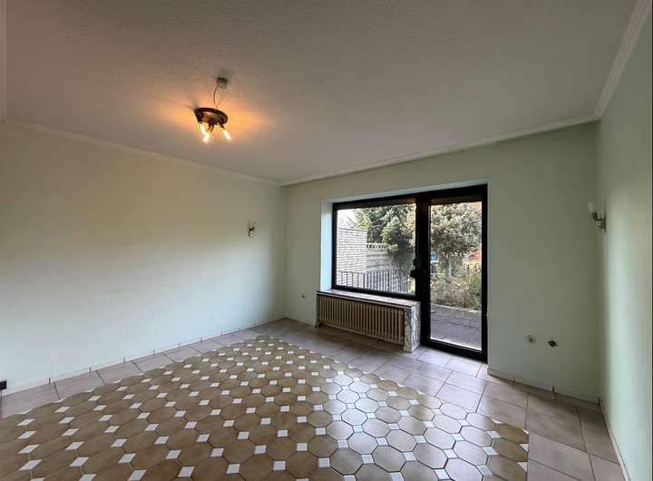 Das Wohn- und Esszimmer im Erdgeschoss bietet einen schönen Überblick über das Grundstück. Von hier hat man Zugang zur Terrasse und in den Garten. Die Küche und ein Gäste-WC sind ebenfalls im Erdgeschoss vorhanden.